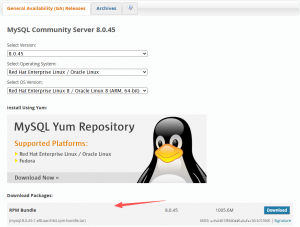 访问MySQL官网下载页面,选择 Red Hat Enterprise Linux 8 / Oracle Linux 8 (x86, 64-bit), RPM Bundle。这个Bundle包包含了所有必要的组件。